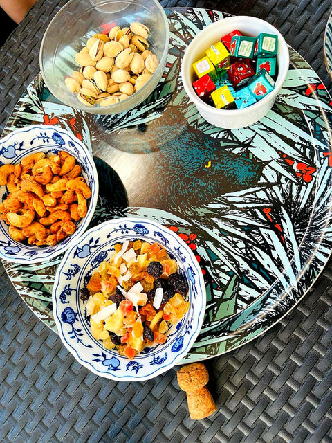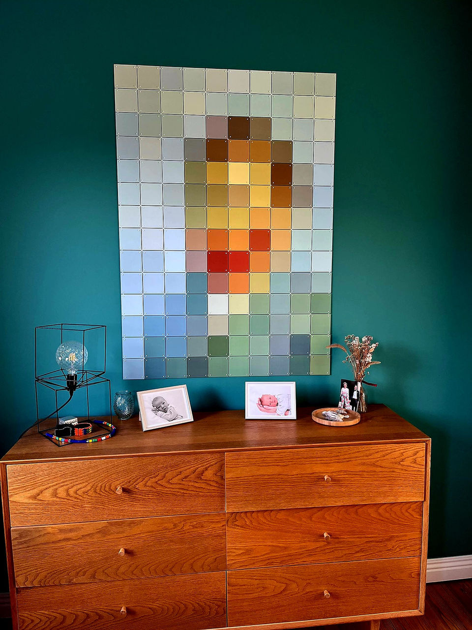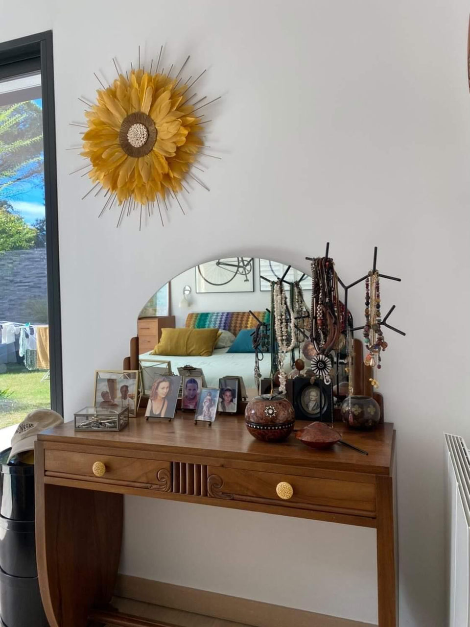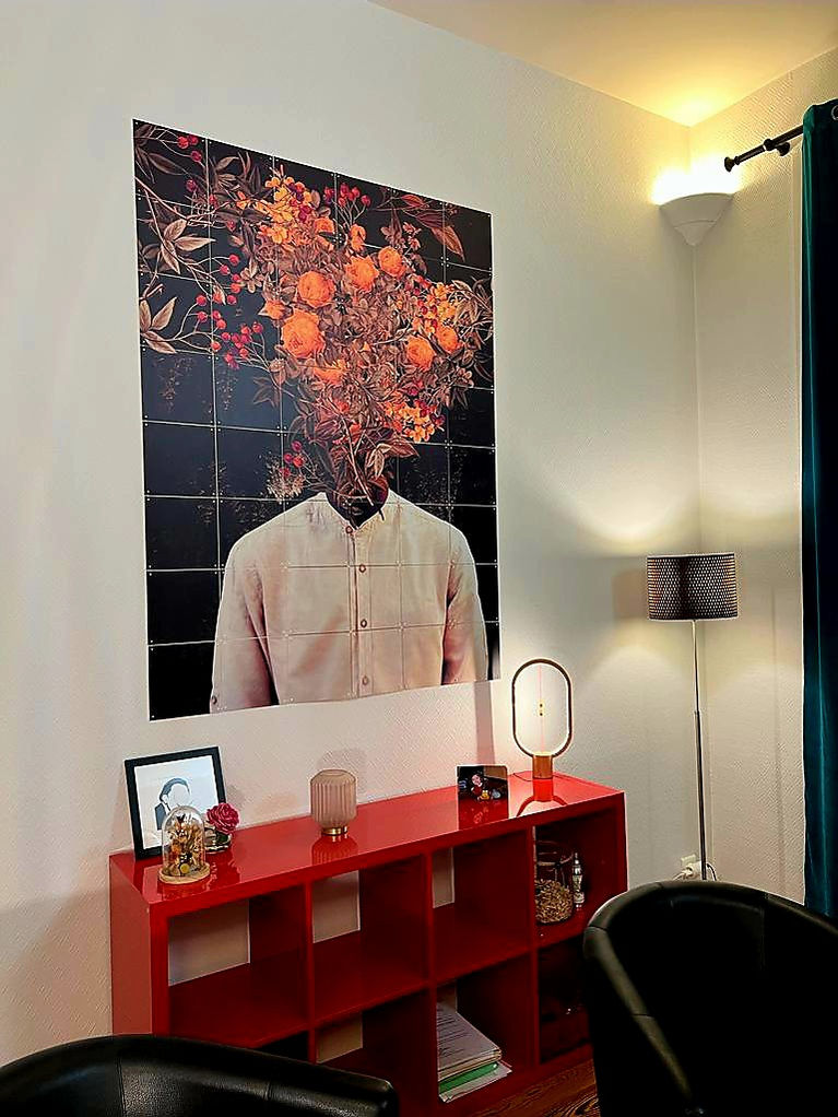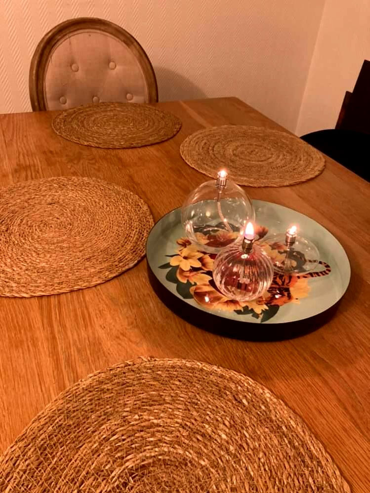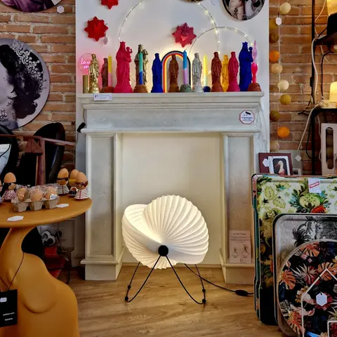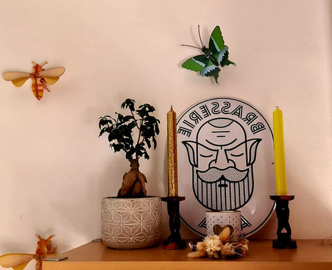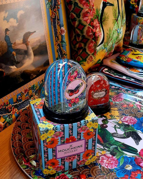 Le verre de la bougie parfumée Mexico est recouvert d’une sérigraphie de couleurs et d’or représentant un ex-voto cœur, petit objet qui servait spirituellement à adresser un vœu ou remercier de la grâce qu’on nous accorde. Ces motifs de cœur se placent tout autour du verre et au fond on peut subtilement remarquer un motif de broderie que l’on retrouve dans l’artisanat mexicain et sur les corsages de Frida Kahlo.